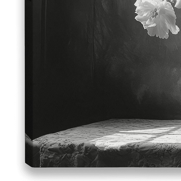 Bestelle dieses Blumen-Wandbild Schwarz-weißes Stillleben mit Blumen und Früchten in extrem dramatischem Licht von Gelissen Artworks als Reproduktion auf Leinwand, Alu-Dibond, als Poster, Fototapete oder Acrylglasbild.
