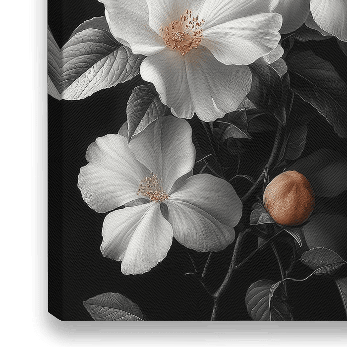 Bestelle dieses Blumen-Wandbild Schwarz-weißes Stillleben mit Blumen und Früchten in extrem dramatischem Licht von Gelissen Artworks als Reproduktion auf Leinwand, Alu-Dibond, als Poster, Fototapete oder Acrylglasbild.