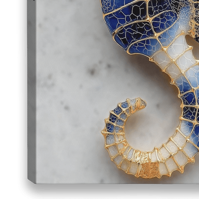 Bestelle dieses moderne Wandbild Seepferdchen in Delfter Blau und Gold auf weißem Marmorgrund von Gelissen Artworks als Reproduktion auf Leinwand, Alu-Dibond, als Poster, Fototapete oder Acrylglasbild.