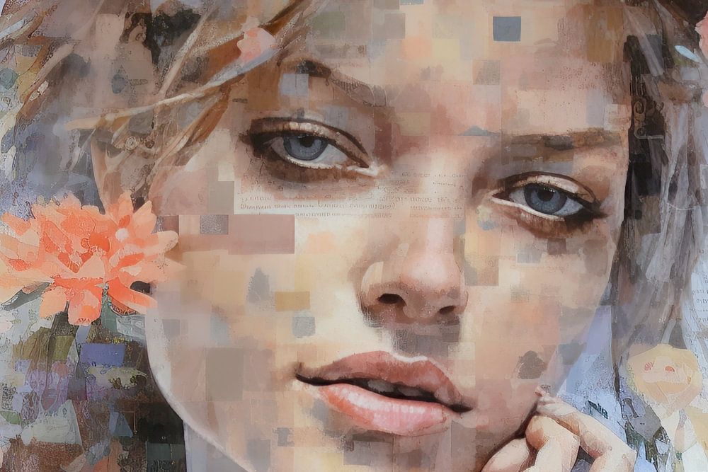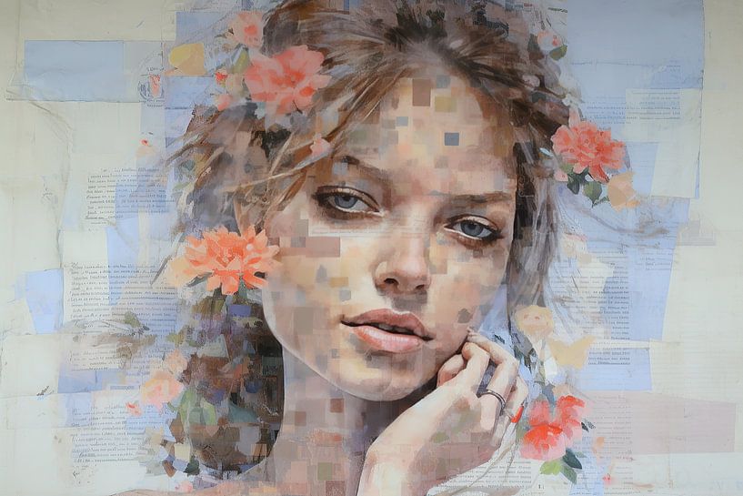 Stella Portrait - abstrakte Malerei / Mischtechnik gemalt. Schöner Kontrast zwischen anspruchsvollem Portrait und roher Collage/Maltechnik.