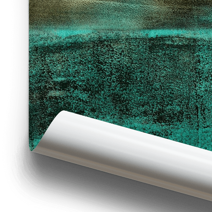 Bestelle dieses Landschafts-Wandbild Stimmungsvolle, minimalistische Landschaft. Abstrakte Malerei in blau, grün, rostig braun von Dina Dankers als Reproduktion auf Leinwand, Alu-Dibond, als Poster, Fototapete oder Acrylglasbild.
