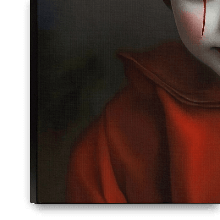 Ein rührendes Bild eines Kindes, das als eleganter Clown gemalt ist. Das Gesicht ist dezent mit zarter Schminke verziert, die die Gesichtszüge hervorhebt, ohne den spielerischen Charakter zu verlieren. Sie trägt eine leuchtend rote Mütze, die ihr Gesicht umrahmt. Ihre Augen begegnen dem Blick des Betrachters mit einem intensiven und…