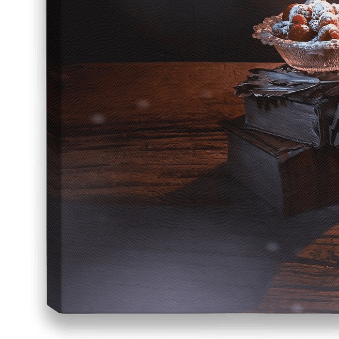 Humorvolles, verträumtes Stillleben mit Obst, Kerzenlicht und Miniaturmenschen. Bringt eine heitere Atmosphäre in Ihren Raum und ein Lächeln. Auch sehr schön als wandfüllende Tapete.