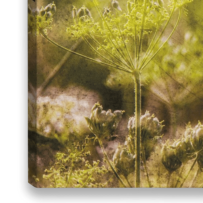Wildblumen blühen im Sonnenschein am Waldrand. Die einen stehen in voller Blüte, die anderen sind bereits verblüht. Fotografie mit Textur hinterlegt.
