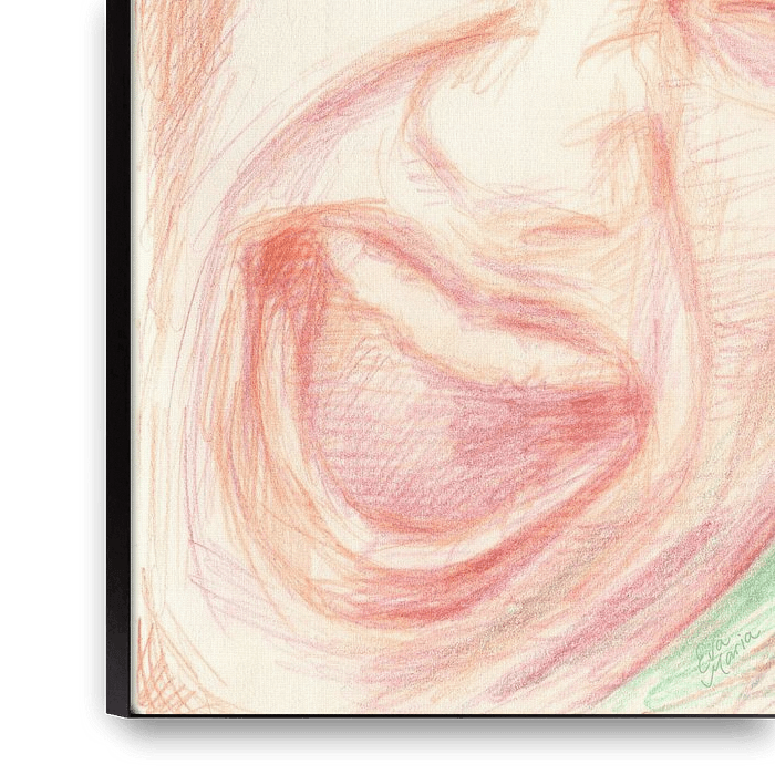 Porträt des Gesichtes einer Frau. Sie lacht komplett. Zeichnung, Buntstift in sanften Rot-, Orange- und Grüntönen.