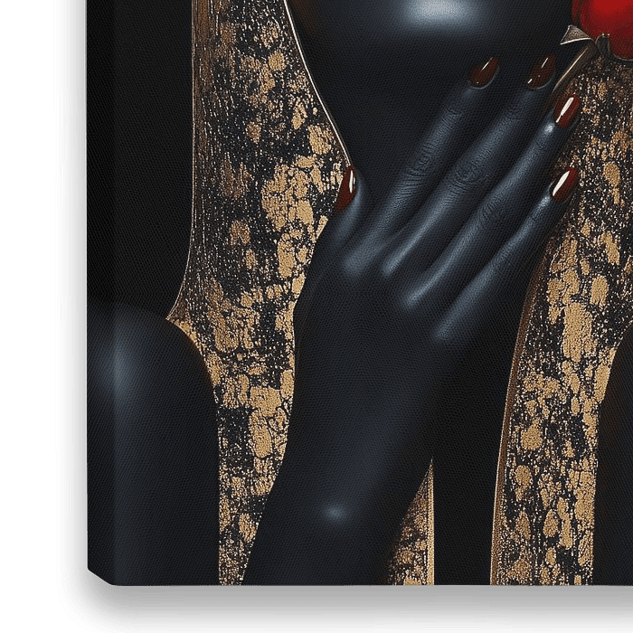 Entdecken Sie unsere exklusive Kollektion von Frauenbildern in Gold, Schwarz und Rot, die mit künstlicher Intelligenz geschaffen wurden.