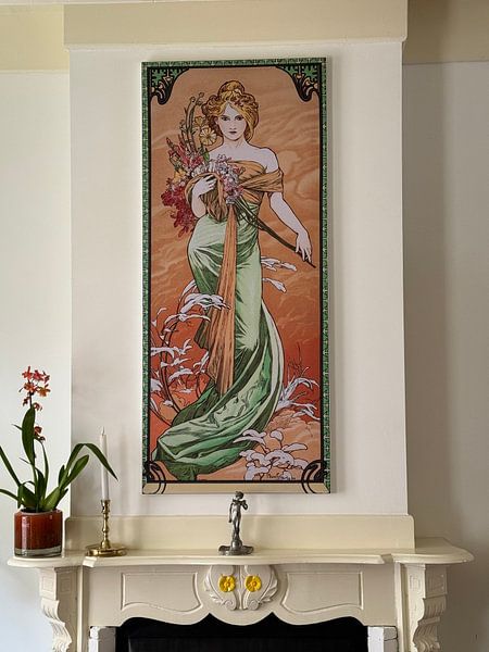 Hochformatige Motive entfalten ihre Wirkung besonders gut an schmalen Wandabschnitten - etwa zwischen zwei Fenstern oder neben einem Türrahmen. Die fließende Komposition in Frühling, Alphonse Mucha (Serie Jahreszeiten) kommt in dieser Ausrichtung besonders schön zur Geltung und nutzt die Höhe deines Raums optimal aus.