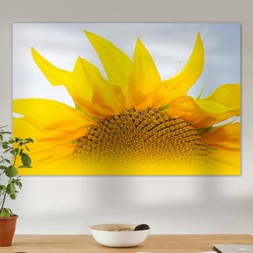 Eine Sonnenblume, die aussieht wie ein Gesicht mit einem blauen Hintergrund von Matthias Korn