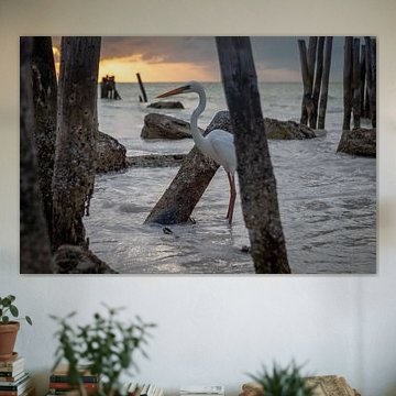 Reiher im Meer während des Sonnenuntergangs - Isla Holbox Mexiko von Sander Hupkes