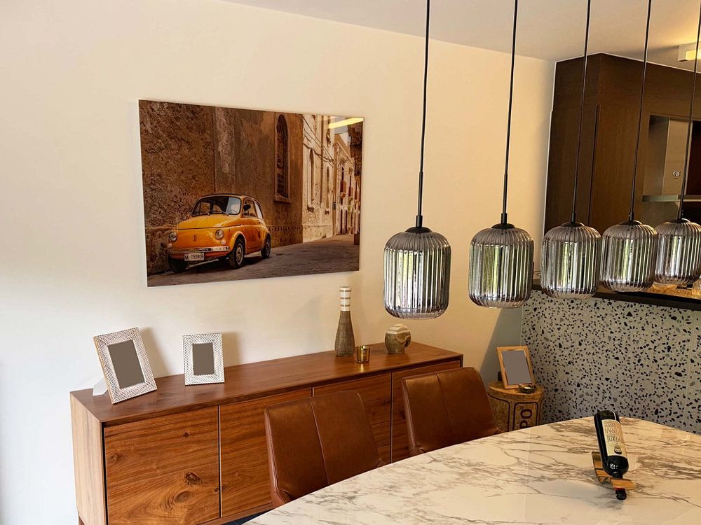 Querformat ist die ideale Wahl für Oldtimer, weil es die dynamische Linienführung klassischer Fahrzeuge optimal zur Geltung bringt. Platziere horizontale Formate über dem Sofa, der Kommode oder im Essbereich - dort entfalten sie ihre volle Wirkung und schaffen Weite im Raum. Für schmale Wandflächen zwischen Fenstern oder im Treppenhaus funktioniert auch Hochformat gut, besonders bei Detailaufnahmen von Karosserien oder Chromdetails. Quadratische Formate bieten sich an, wenn du mehrere Motive aus der Kollektion Oldtimer nebeneinander arrangieren möchtest.