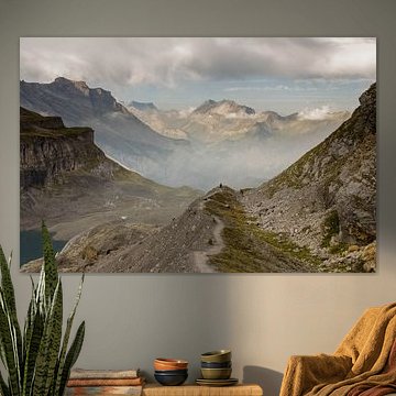 Sentier de montagne avec randonneur en montagne lors de la descente vers Kandersteg dans les montagnes suisses