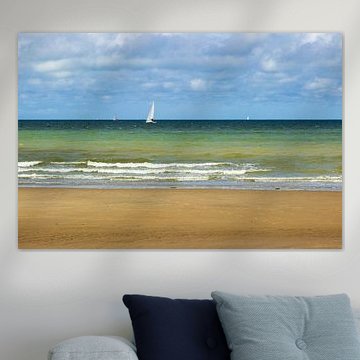 Paysage marin bleu avec des voiliers et des montagnes en arrière-plan