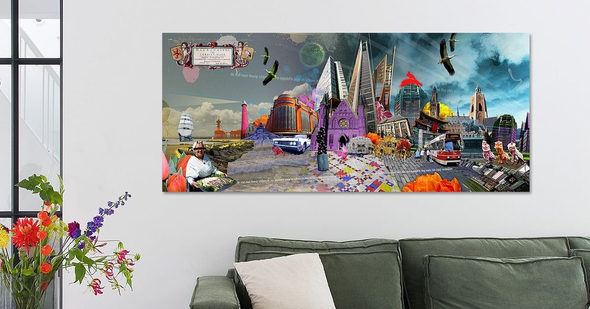 Aha Collective / Herman van Belkom heeft een passie voor fotograferen, verzamelen van grafiek, stempels, structuren etc. Herman maakt na het ervaren van een stad, evenement etc. een nieuwe skyline en zet deze om in prachtige collages op groot formaat.