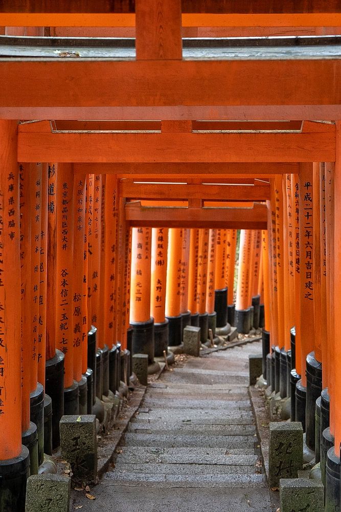 C'est en me promenant près du temple Senbon Torii (juste à l'extérieur de Kyoto) que j'ai pu capturer cette belle image. Le temple se compose de 1 000 portes orange, chaque porte représentant un entrepreneur local qui soutient le temple en échange de sa protection.
