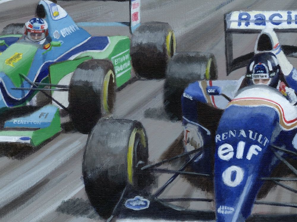 Damon Hill (GBR), Rothmans Williams Renault FW16 et Michael Schumacher (GER), Mild Seven Benetton Ford B194 au Grand Prix de Grande-Bretagne à Silverstone en 1994 par Toon Nagtegaal.