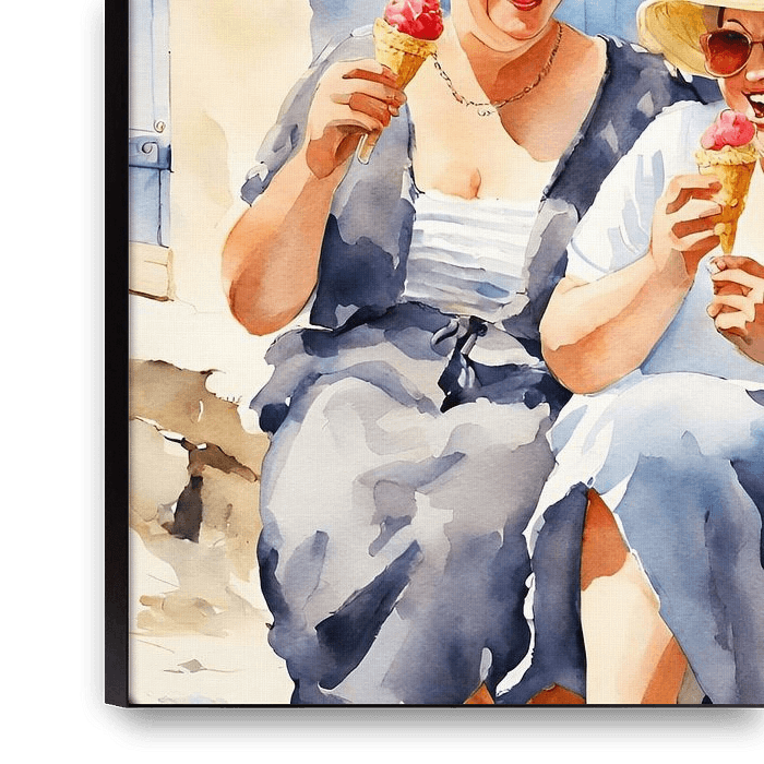 Acheter ce tableau 2 dames sociables mangent une glace par De gezellige Dames sur toile, aluminium, ArtFrame ou photographie (encadrée), impression d'art en haute qualité et tout format.