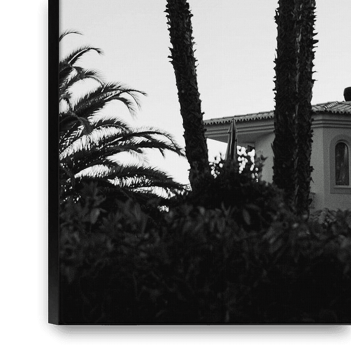 3 palmiers devant une finca au bord de l'Atlantique en Protugal. Photographie en noir et blanc.