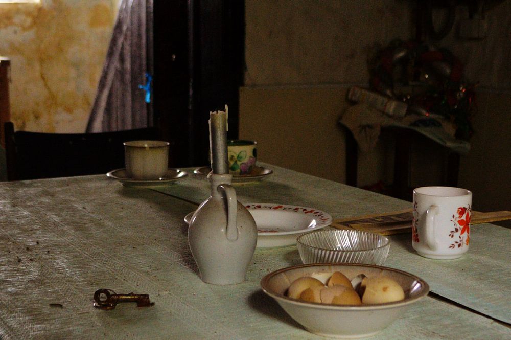 Urbex. Maison Boon. à la table. on dirait que quelqu'un pourrait rentrer directement à la maison. Maison abandonnée en Belgique. pourquoi seraient-ils partis ? mystérieux... unique. une photo en dit parfois plus que les mots.