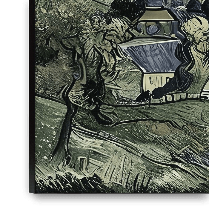 Cette peinture, manifestement inspirée par le mouvement post-impressionniste, présente une scène nocturne captivante, baignée dans une ambiance à la fois mystique et tourmentée. Le ciel, élément central de l'œuvre, est animé par des spirales tourbillonnantes et nuageuses qui semblent se mouvoir avec une intensité dramatique. Ces volutes célestes, magnifiées par une palette de bleus profonds et de touches de blanc, insufflent une dynamique presque cosmique à la composition. Au premier plan, un paisible village se déploie, ses toits apparaissant comme des blocs solides et rassurants. Le clocher d'une église, avec sa silhouette élancée, s'élève fièrement parmi les arbres sombrement rendus. Dans ce cadre champêtre, les maisons recouvertes d'un éclairage subtil semblent s'endormir sous ce firmament agité. Les champs et les routes se dessinent avec des contours sinueux, guidant le regard à travers ce paysage reposant. La technique remarquable de l'artiste se révèle dans le traitement distinctif des textures et les coups de pinceau vigoureux qui donnent un rythme et une énergie vibrante à l'ensemble de l'œuvre. Chaque élément, qu'il s'agisse du ciel, des arbres ou des bâtiments, est exécuté avec une précision qui confère à la scène une harmonie intemporelle tout en capturant une impression fugace de la nature. Cette peinture n'est pas simplement une représentation d'un paysage, mais une exploration émotionnelle de la nature et du cosmos, traduite par l'artiste en une symphonie visuelle inoubliable.