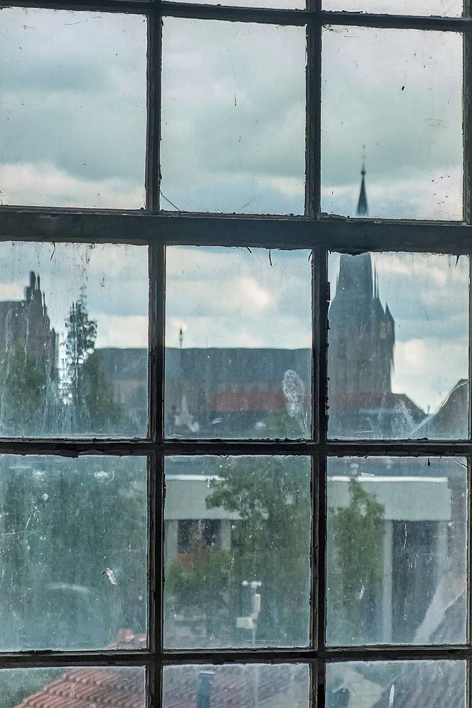 Abandonné van Heutsz bâtiment intérieur de l'école dans la ville de Kampen avec des planchers et des plafonds endommagés. La lumière entre dans la fenêtre sale et endommagée et le Bovenkerk est visible dans la fenêtre.