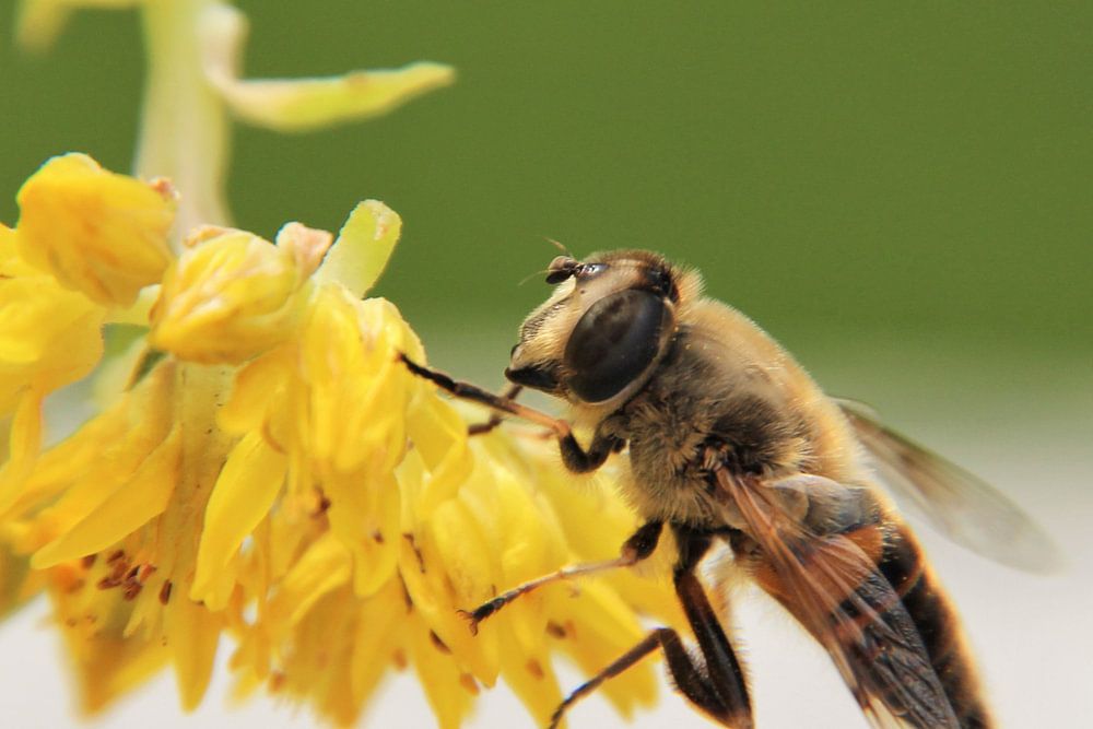 Je me suis assis à la table à l'extérieur pour profiter de la chaleur de l'Alpenzon suisse. Devant moi se tenait un petit vase avec des fleurs jaunes, que certaines abeilles semblent très friandes. J'ai pris mon objectif macro et j'ai cliqué !
