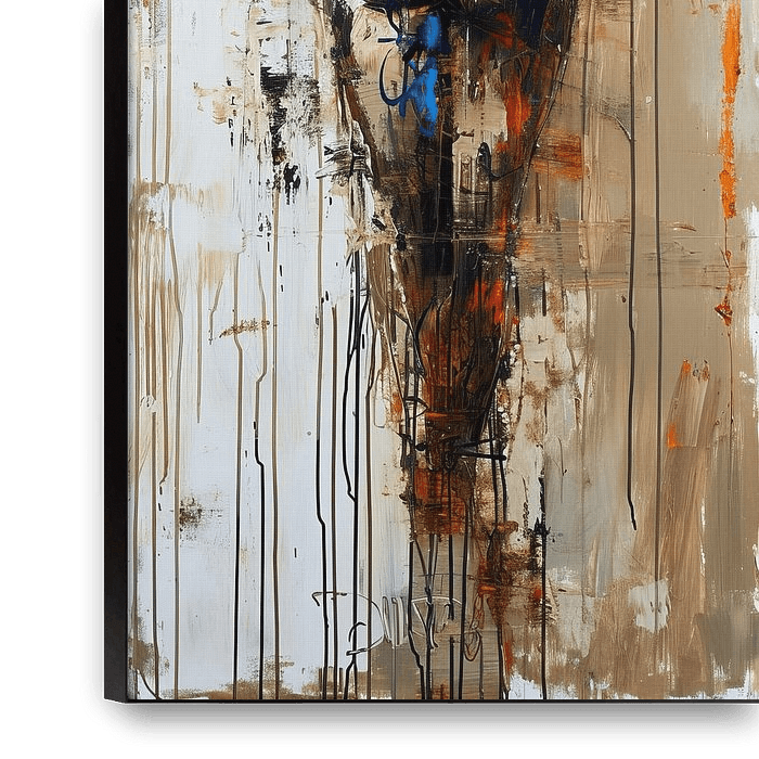 Figurative abstraite - Blue Essence - Cette peinture représente une figure humaine abstraite prise dans une tension de texture et de couleur. Le style est typiquement urbain, avec un effet rugueux de couteau à palette et de subtiles nuances figuratives. La combinaison dynamique du bleu profond et des tons terreux crée une profondeur fascinante à laquelle l'œil ne cesse de revenir. Détails : abstrait, figure, bleu, brun, texture, urbain, moderne, art, dynamique, contraste, beauté brute Couleurs : bleu profond, brun terre, blanc ivoire, orange rouille, noir Abstrait Figuratif