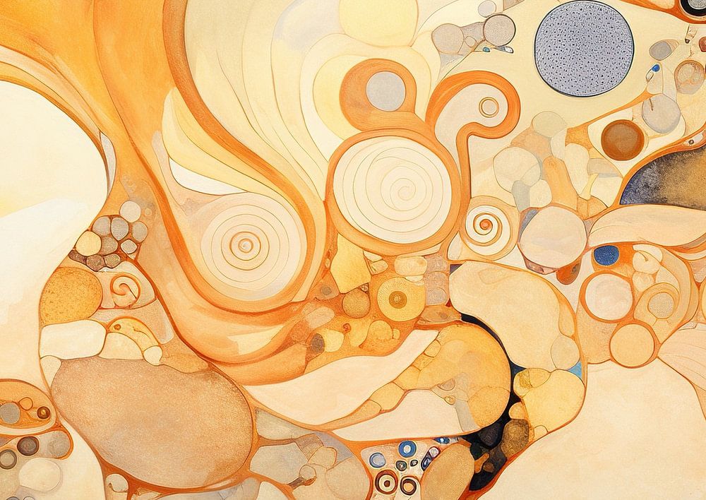 Détails : abstrait, organique, nature, orange, jaune, bleu, chaud, ondulé, rêveur, texture, éclat chaud