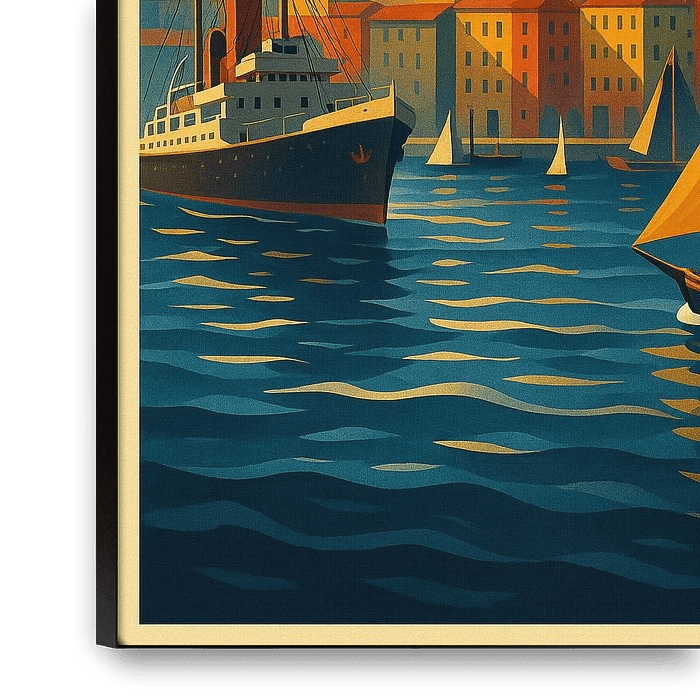 Cette affiche Art déco de Gênes capture l'esprit vivant de la côte ligure, avec des maisons colorées à flanc de colline surplombant un port animé. Des formes géométriques audacieuses et des rayons de soleil radieux créent une atmosphère rétro nostalgique qui rappelle les affiches de voyage méditerranéennes classiques. Des voiliers et un…