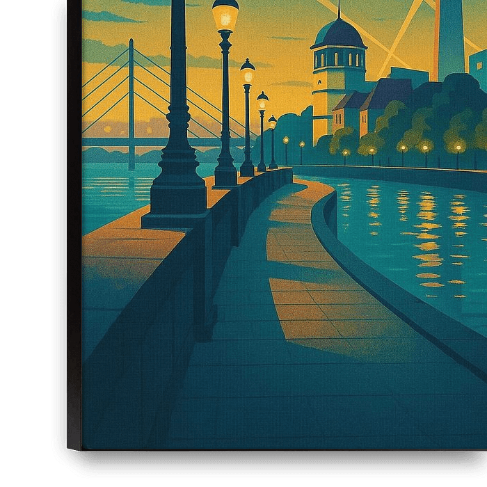 Cette affiche de Düsseldorf capture l'élégance de la ligne d'horizon de la ville le long de la promenade du Rhin. Avec la tour Rheinturm qui brille dans le ciel du soir, l'œuvre d'art combine l'architecture moderne, les lumières vibrantes de la ville et les reflets calmes du fleuve. Düsseldorf est connue pour sa mode, son art et sa…