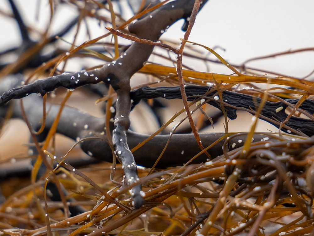 Gros plan sur des algues sur la plage des îles Lofoten. C'était une journée grise, mais c'était tellement beau que je l'ai trouvé photogénique. Pour les amoureux de la plage, c'est une belle photo.