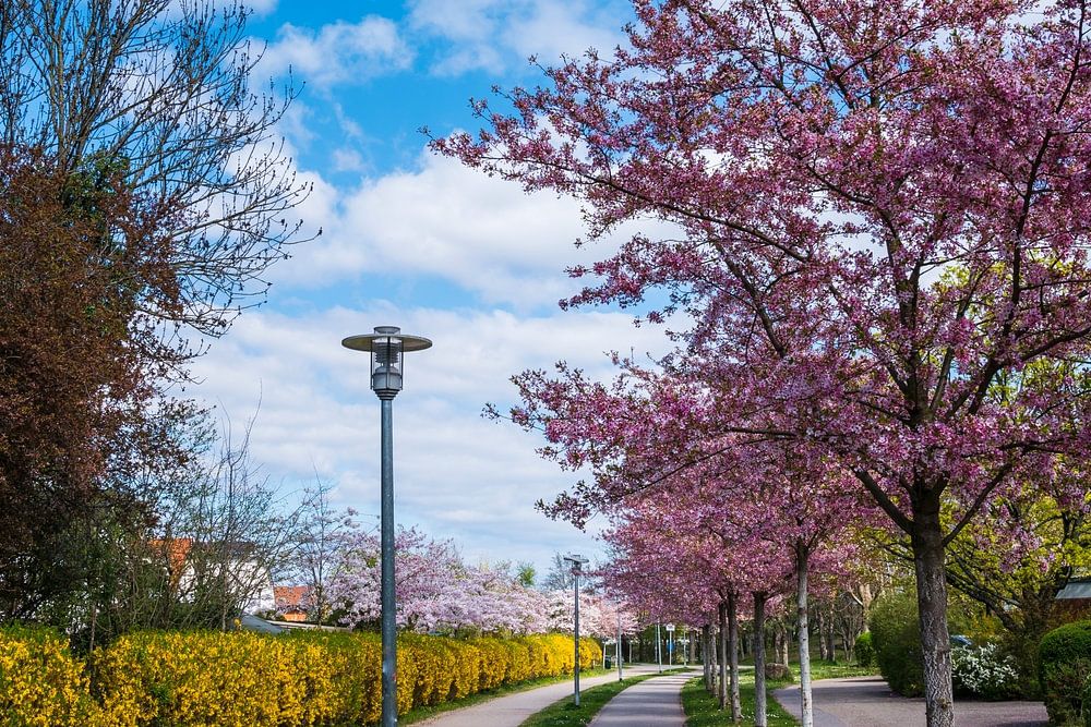 Allemagne, atmosphère romantique et colorée du printemps dans une rue de la ville de Fribourg-en-Brisgau avec des arbres en fleurs et des haies de couleur rose, jaune et violette.