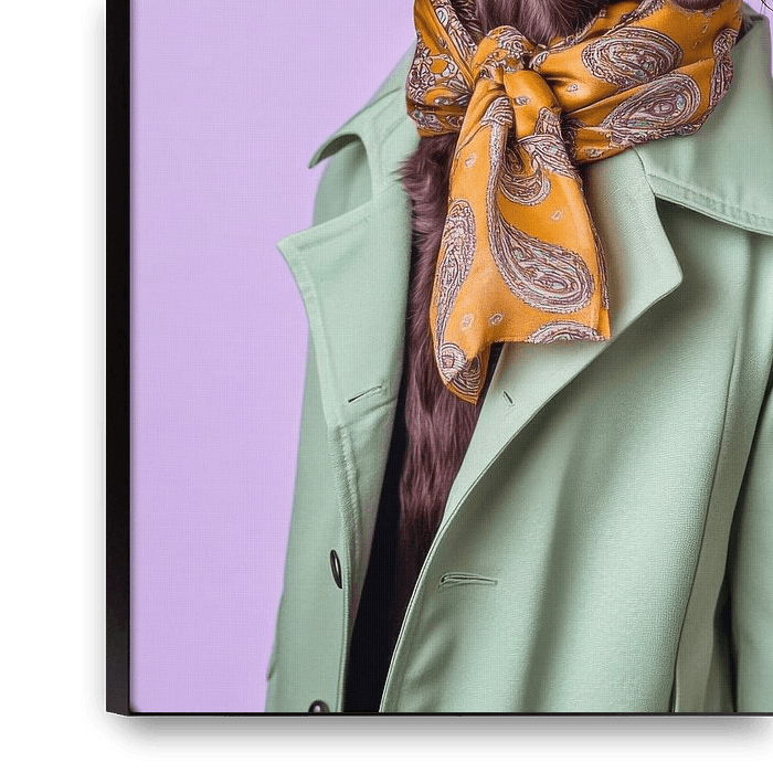 Une créature charmante et stylée, vêtue d'un manteau vert menthe et ornée d'un élégant foulard. Les yeux chocolat brillants respirent l'intelligence, tandis que le bonnet chic confère à l'allemand à poil court une touche de caractère et d'élégance. Une véritable icône de mode parmi les quadrupèdes !