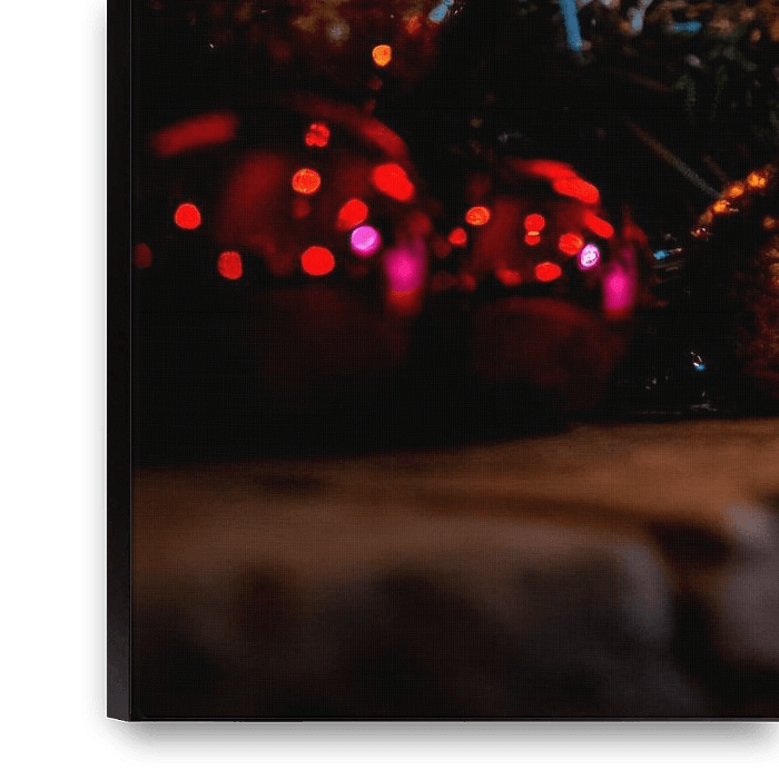 Un jeu de flammes chaudes entoure des boules de Noël décorées de manière festive, qui brillent d'un éclat doré et rouge. La cheminée rustique et les douces lumières du sapin décoré favorisent un sentiment de sécurité et de fête. Cette atmosphère accueillante est parfaite pour le salon, où la famille et les amis peuvent se réunir.