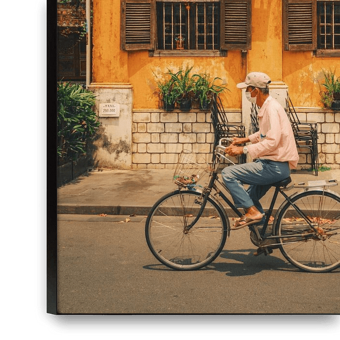 La photo montre une scène de rue authentique dans la vieille ville de Hoi An, au Vietnam. Au centre se trouve un cycliste qui passe, détendu, devant une façade coloniale magnifiquement rénovée, aux volets ouverts et aux décorations florales soigneusement entretenues. Les chaudes nuances de jaune et de rouge du mur de la maison combinent…