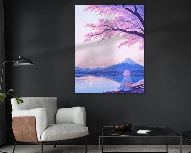 Cette œuvre capture la beauté éphémère des fleurs de sakura face à la majesté intemporelle du mont Fuji. Le personnage en kimono regarde l'horizon, incarnant une pause tranquille entre le passé et l'avenir. Baignée dans de douces teintes roses et violettes, c'est une méditation sur l'éphémère, la sérénité et l'harmonie entre la nature et la présence humaine.