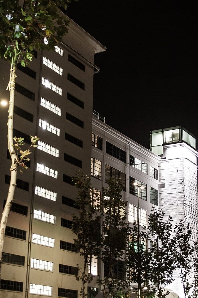 Nachtfoto van het gebouw "Anton" die in de hoge rug van Strijp-S in Eindhoven staat. Dit gebouw, waar vroeger nog de productie van Philips was zijn momenteel lofts gebouwd.