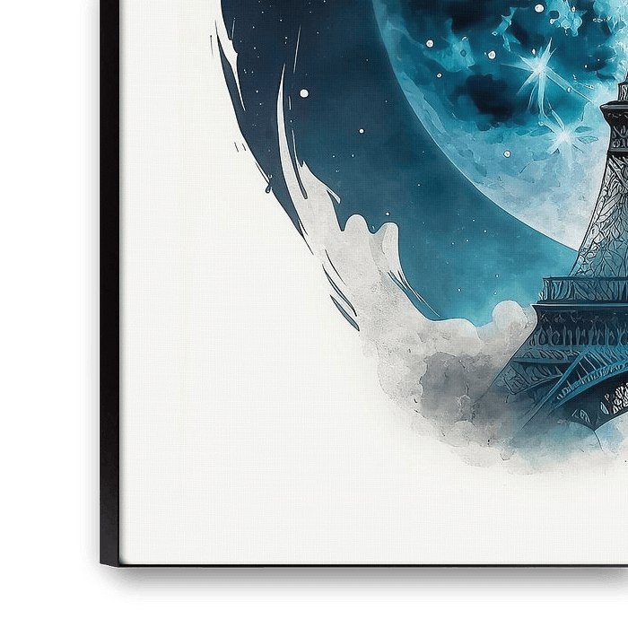 Cette aquarelle ronde et moderne de la Tour Eiffel à Paris représente une scène nocturne. La tour Eiffel est au premier plan, au centre du tableau. La pleine lune géante à l'arrière-plan crée un effet d'aliénation. Il s'agit d'une interprétation unique d'un symbole parisien bien connu, qui ne manquera pas d'attirer l'attention sur n'importe quel mur.