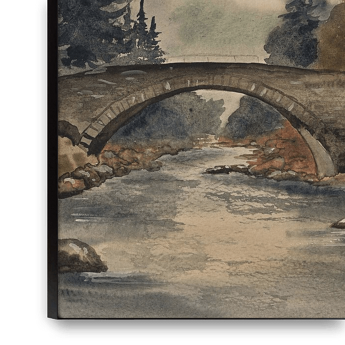 Aquarelle ou peinture à l'eau d'un paysage d'hiver avec une rivière et un petit pont qui l'enjambe. Sur la rive se trouve une jolie petite église. Le ciel est menaçant.