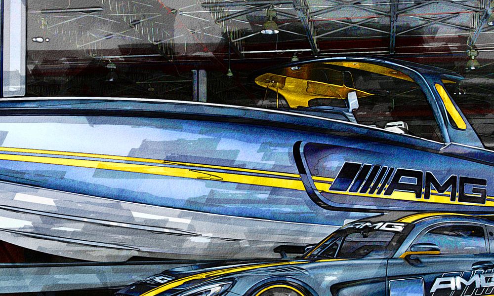 Bateau et voiture Mercedes AMG en peinture aquarelle numérique. Une aquarelle soignée, couche par couche, d'un bateau à moteur et d'une voiture Mercedes AMG. Cette œuvre unique est de très haute qualité et a été soigneusement construite par couches. Et est disponible en différents matériaux et tailles. Avec ce design, vous aurez un véritable accroche-regard dans votre maison qui fera sûrement ressortir votre visite.