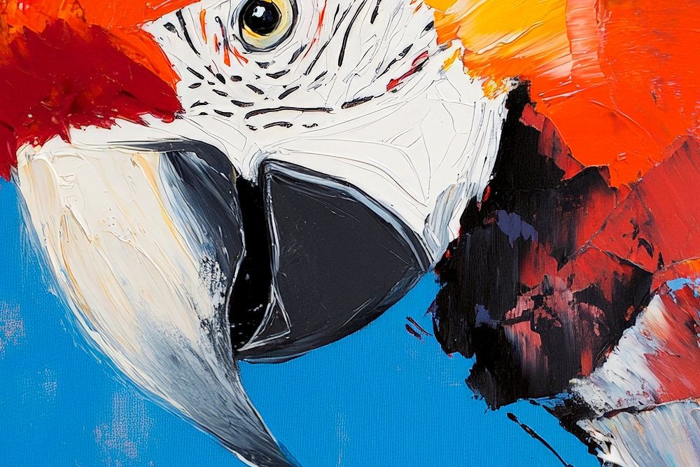 Un jeu de couleurs vives composé d'un orange vif, d'un jaune éclatant et d'un bleu profond attire tous les regards. La tête majestueuse d'un propriétaire à la beauté naturelle incarne la liberté et la joie de vivre. Parfait comme eyecatcher dans le salon, cette œuvre d'art apporte une touche d'élégance tropicale dans chaque pièce.