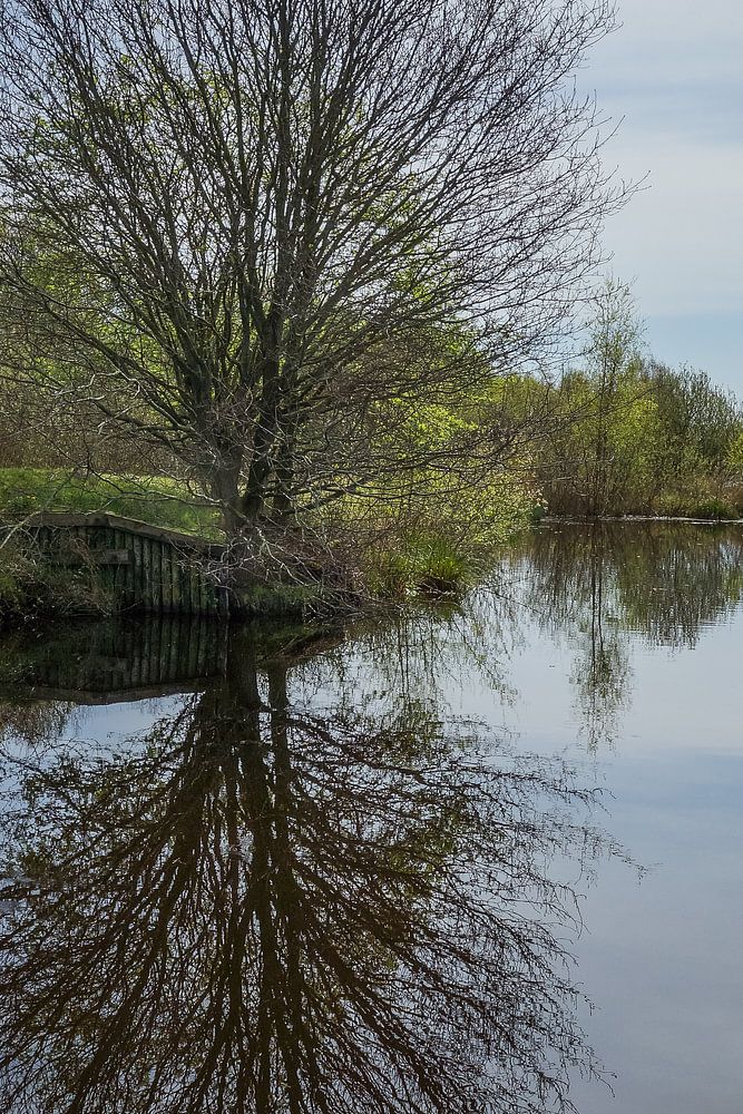 Réflexion dans l'eau dans la réserve naturelle de Deelen. Le Deelen se compose de roselières, de trous de courant d'air avec relativement beaucoup d'eau libre, de fourrés et de prairies. Les trous de tension dans le Deelen sont relativement récents, car les gens n'ont commencé à peindre ici que vers 1920.