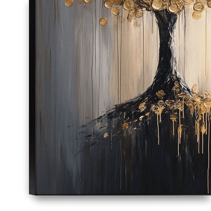 Cette magnifique œuvre d'art abstraite représente un arbre avec une particularité : à la place des feuilles, l'arbre porte des pièces d'or. Les pièces sont peintes avec une texture détaillée et semblent presque sortir de la toile. Le contraste entre la silhouette sombre du tronc et l'éclat des pièces d'or crée un effet dramatique,…