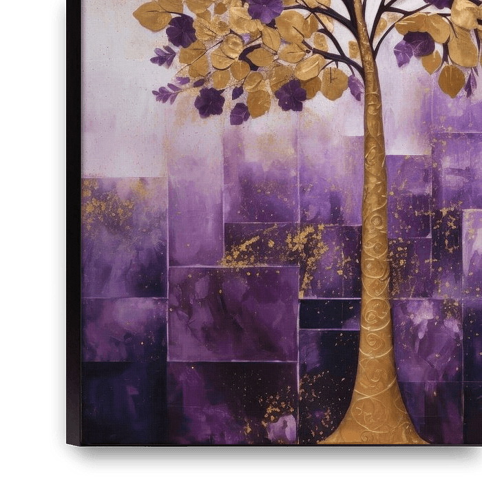 Peinture numérique abstraite moderne d'un arbre dans des tons dorés et violets éclatants.