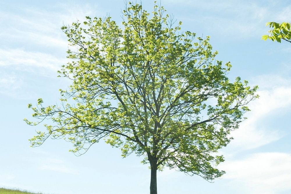 Findon UK Ciel bleu azur sur les South Downs. Un arbre sur les pentes du fort de Cissbury Ring Hill éclate en feuilles dans un kaléidoscope de verts.