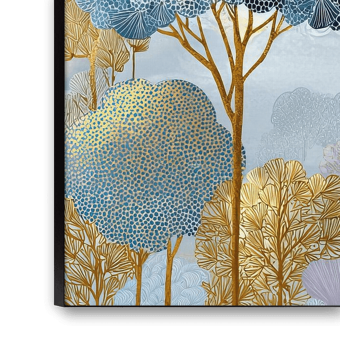 Arbres bleus - Cette peinture abstraite représente un paysage de rêve avec des arbres aux formes ondulées dans différentes nuances de bleu et d'or, parfait pour un intérieur moderne.