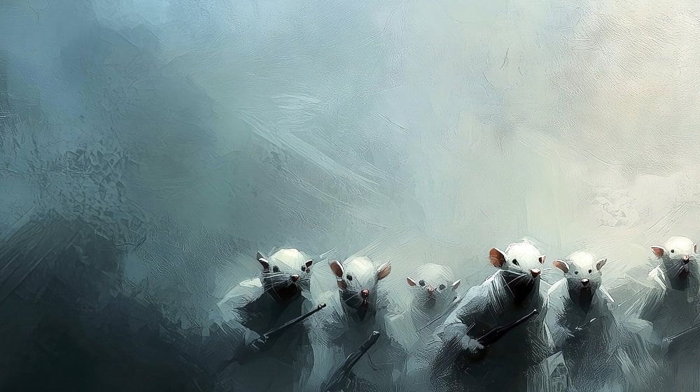 Cette illustration numérique montre une scène lugubre d'une armée de rats marchant dans un épais brouillard, armés de fusils. L'atmosphère inquiétante et les éléments surréalistes rendent cette œuvre idéale pour illustrer des thèmes tels que la dystopie, la guerre, la dictature et l'oppression.