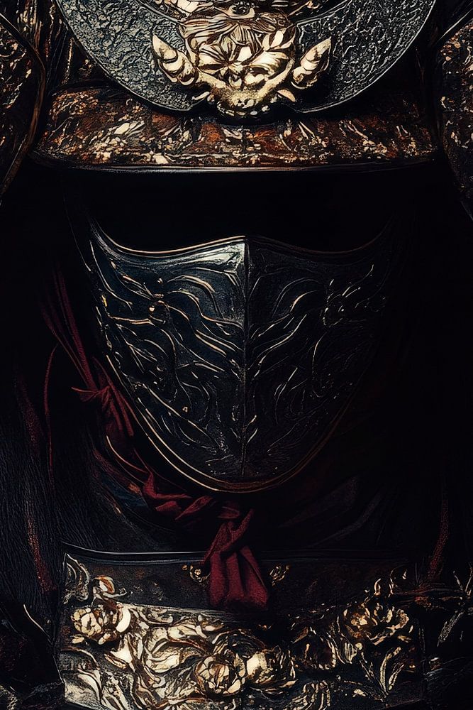 Un guerrier majestueux, enveloppé dans des armures chatoyantes en métal sombre, dégage une aura mystérieuse. Les détails artistiquement décorés et le casque puissant confèrent à cette image une présence captivante qui s'intègre parfaitement dans un salon élégant ou un environnement de bureau créatif. L'histoire prend ici vie et incite à la réflexion.