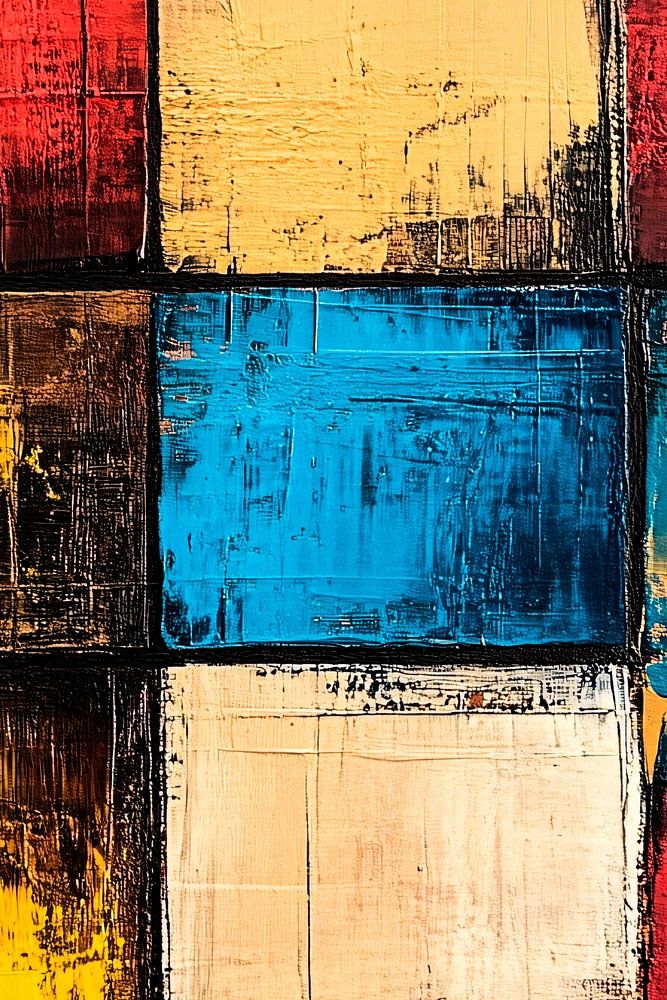 Ce motif coloré est un chef-d'œuvre abstrait qui s'intègre parfaitement dans les intérieurs modernes. Avec ses surfaces lumineuses en rouge, bleu, jaune et blanc sur un fond sombre, il crée un ensemble puissant et dynamique. Cette œuvre d'art dégage de l'énergie et de l'équilibre et est idéale pour un salon ou un bureau. Elle met l'accent sur la créativité et attire le regard dans n'importe quelle pièce.