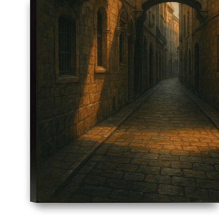 L'atmosphère du quartier gothique capture l'une des plus anciennes rues de Barcelone à l'orée du jour. La lumière glisse doucement sur la pierre usée par les intempéries, illuminant les balcons et les arcades d'un or mielleux. Sous le pont orné, les ombres s'allongent et une seule lueur chaude provenant de la fenêtre d'un café lointain…