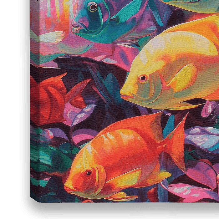 Une œuvre d'art représentant le monde sous-marin, peuplé de poissons colorés aux motifs et textures saisissants, dans un paysage sous-marin composé de coraux et de plantes aquatiques. La composition donne une image vivante et dynamique de l'atmosphère sous-marine.